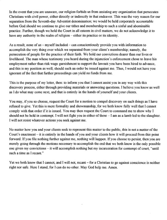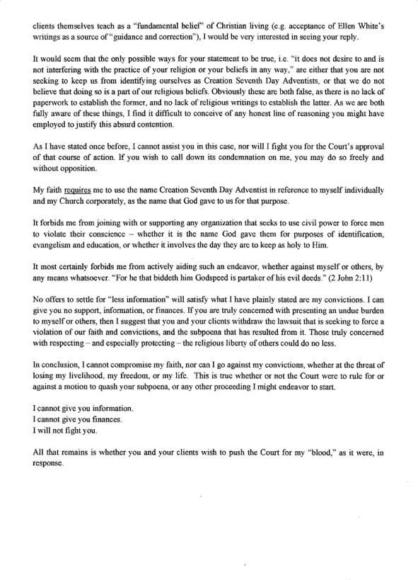 In this case, it is entirely at the discretion of the General Conference of Seventh-day Adventists and their attorney, Mr. Galanter, if they will request the Court to use force in response to my inability to comply with their demands. In a standard lawsuit the purpose for this is to coerce the person to comply with the demand for information, yet both the General Conference and Mr. Galanter are keenly aware that our convictions are not open to revision upon imprisonment.