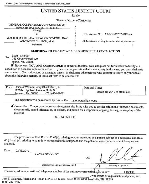 *No reply was received to the previous letter. On March 12th, Lucan learned that Mr. Galanter had asked Mr. Holliday, Pastor McGill's attorney, if he knew whether Lucan intended to appear at the deposition.