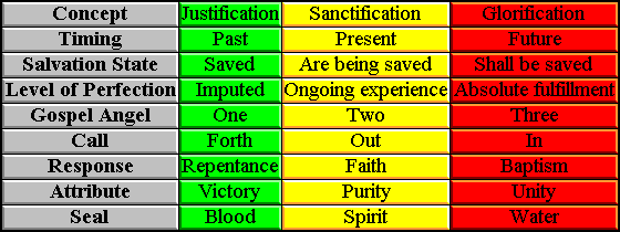 The First angel, as we saw two months ago, deals with Justification and the Blood Seal. The Second deals with Sanctification and the Spirit Seal. The Third, naturally, must deal with Glorification and the Water Seal.