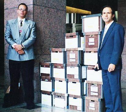Andres Roman & Rafael Perez Standing next to boxes of court documents used in their defense.