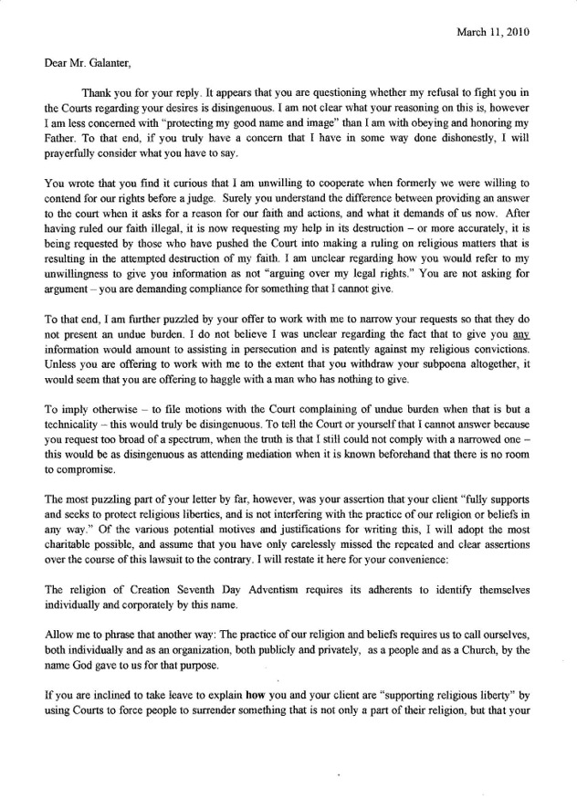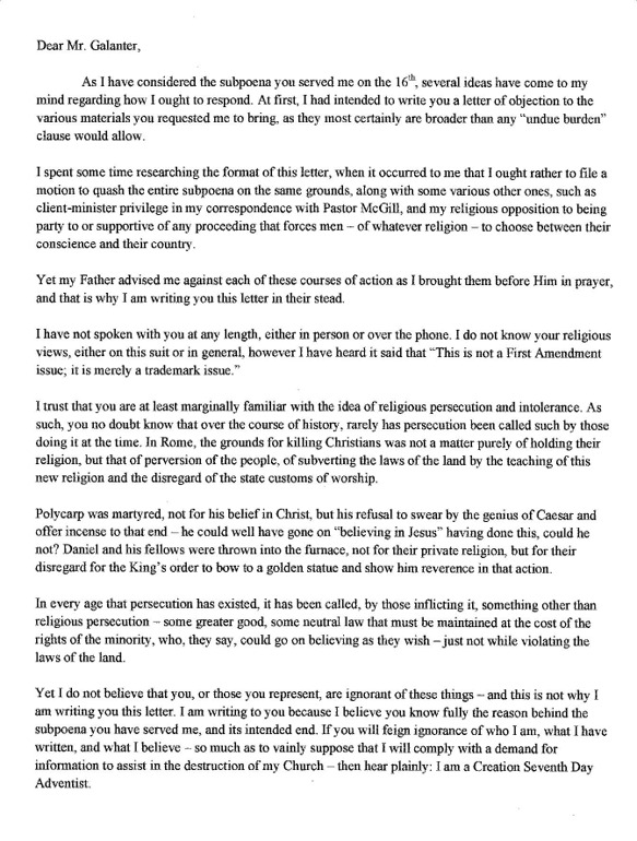 As I stated in my first letter to Mr. Galanter, my first reaction to the subpoena was to fight it by every legal means possible, be it technicality or otherwise. Yet I was cautioned against this both by my brethren and my Father upon earnest prayer. When I realized what I was to do was simply to be as a lamb to the slaughter, allowing them to do with me as they wish in response to my refusal to assist them, my first inclination was likewise to appear at the deposition to be in compliance with the Court inasmuch as I could.