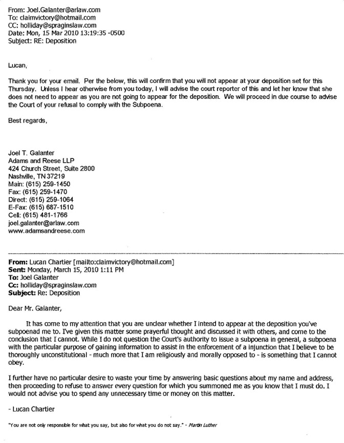 There are some who may wonder – and some who indeed have asked – why I have chosen not to attend the deposition at all rather than attending to be in compliance with the Court, and stating that I cannot answer the questions posed to me. Much like my move to Tennessee, this decision is not one that I entered into lightly or based upon my own desires.