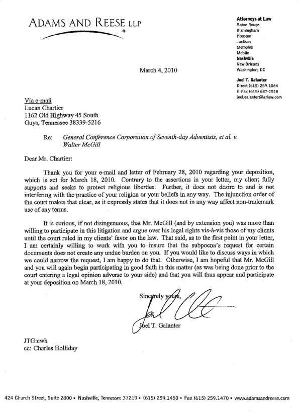 *No reply was received to the previous letter. On March 12th, Lucan learned that Mr. Galanter had asked Mr. Holliday, Pastor McGill's attorney, if he knew whether Lucan intended to appear at the deposition.
