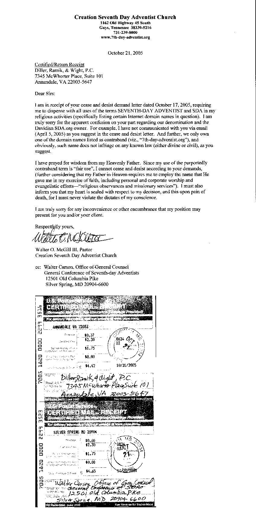 Update 07/22/05: Pastor Walter "Chick" McGill has drafted a letter to the lawfirm being used by the General Conference to enforce the Trademark asking for their understanding in the delay of his receiving the letter, as he is away currently on an evangelistic mission. The Letter may be read here.